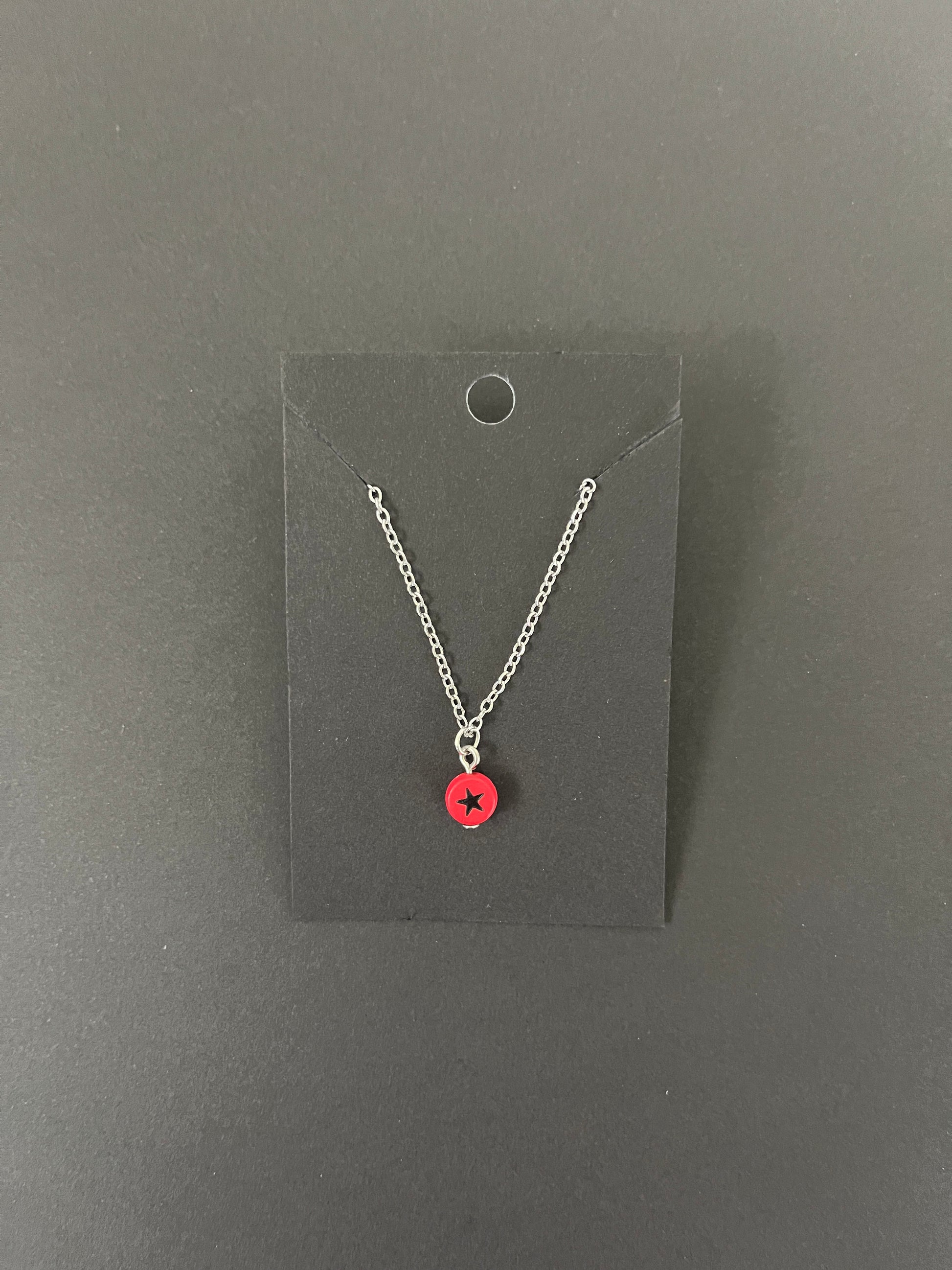 Made with alloy metal and a stainless steel chain, with a small plastic star bead attached